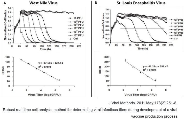 法国Sanofi Pasteur研究所使用xCELLigence RTCA进行登革热病毒CPE和疫苗研发的研究。研究人员先将Vero细胞接种到E-Plate孔板中,再加入不同稀释滴度的登革热病毒或者不同处理组的病毒。他们利用xCELLigence RTCA系统实时追踪记录病毒CPE的发作时间,以及整个过程。同时,通过绘制CITmed(细胞指数降低50%所需的时间)与抗体滴度的标准曲线,量化了阻断病毒CPE的中和抗体浓度。